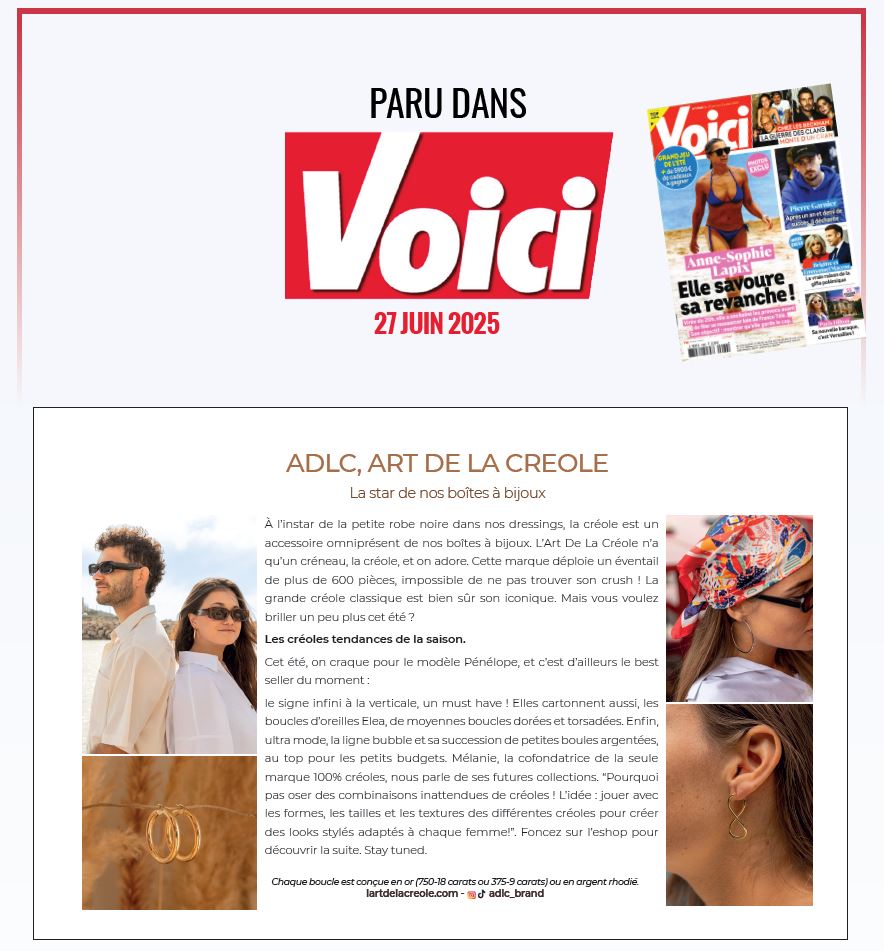 Parue dans Voici le 27 juin 2025, la marque ADLC – Art de la Créole – confirme son statut d’icône dans le monde du bijou. Avec plus de 600 modèles de créoles revisités, elle s’impose comme l’accessoire chic et intemporel de nos boîtes à bijoux. Zoom sur leurs pièces phares et les tendances à adopter pour briller cet été !