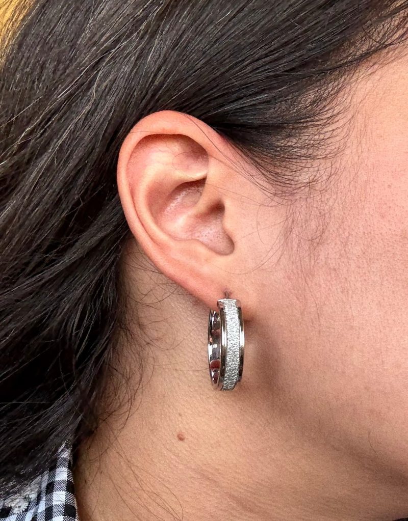 Boucles d’oreilles en argent, tube 6 mm, diamètre 20, à paillettes. Une pièce qui explose de lumière, captant chaque reflet pour un éclat magnifique. Parfaites pour un look audacieux et étincelant, elles transforment chaque mouvement en spectacle scintillant. Un bijou qui fait briller votre style et attire tous les regards.