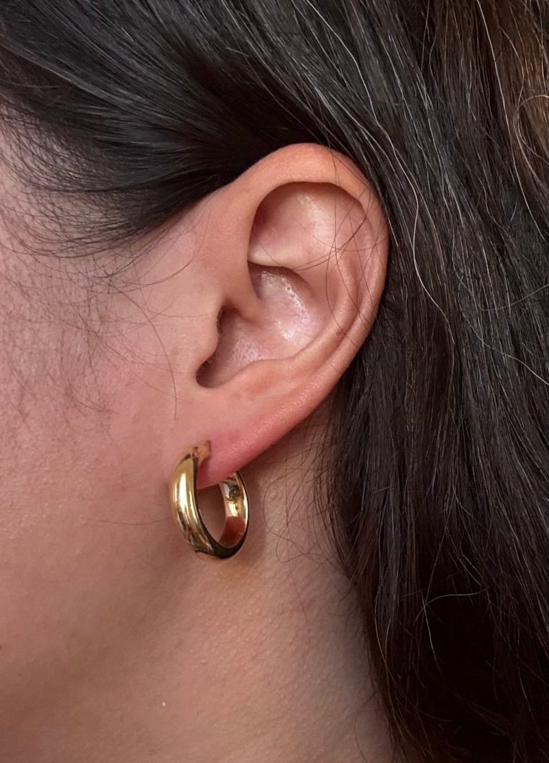 Boucles d’oreilles en or 750 jaune, diamètre 15, demi jonc lisse 5 mm. Une épaisseur généreuse qui marie puissance et raffinement, avec la courbe douce du demi jonc pour un confort absolu. Une pièce qui ose le volume sans sacrifier l’élégance, parfaite pour un style audacieux et lumineux.