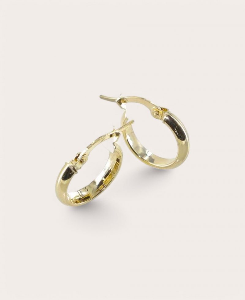 Boucles d’oreilles en or 375 jaune, diamètre 15 mm, demi jonc lisse 3 mm. Plus légères grâce à leur forme semi-ronde, elles allient confort et élégance pour un style raffiné et discret.