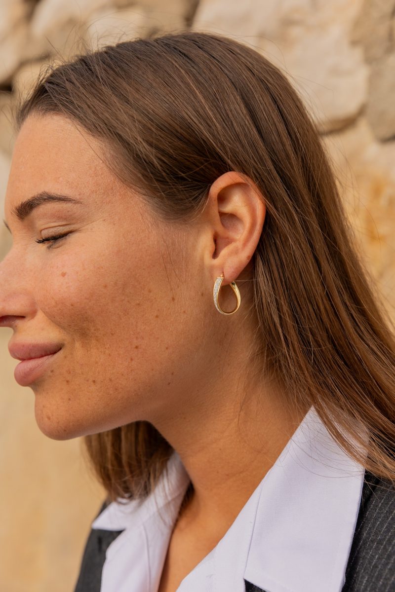 Boucles d’oreilles en or 375 jaune, diamètre 20×14, ondulée tube 4 mm pailleté. Une pièce au design original ondulé, qui scintille à chaque mouvement, vous faisant briller de mille feux. Parfaites pour un look festif et élégant, elles transforment chaque occasion en moment spécial. Un bijou qui vous met en lumière et capte tous les regards.