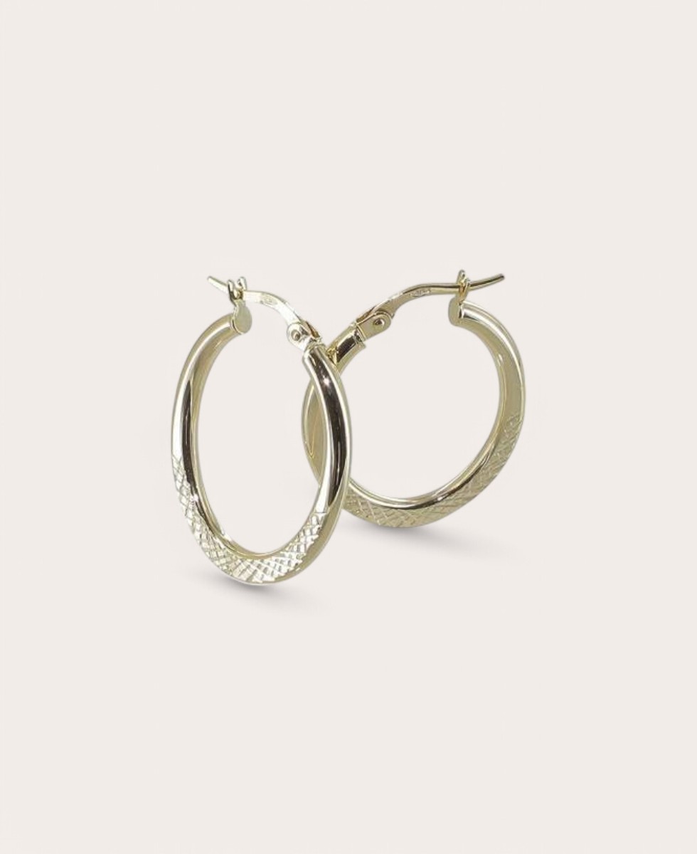 Ces créoles ovales en or 375 incarnent la fusion parfaite de la délicatesse et de l’élégance moderne. Avec une largeur de 2 mm et un diamètre de 22×15 mm, elles apportent un éclat discret mais raffiné à votre style. Un jolie motif subtilement gravé sur le bas de chaque créole, ajoute une touche de texture unique, attirant la lumière avec finesse.
