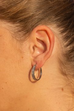 Boucles d’oreilles en argent, petit modèle, ovale 4×2. Une pièce qui capte l’essence de la modernité avec ses paillettes scintillantes, pour un style ultra-contemporain et plein de caractère.