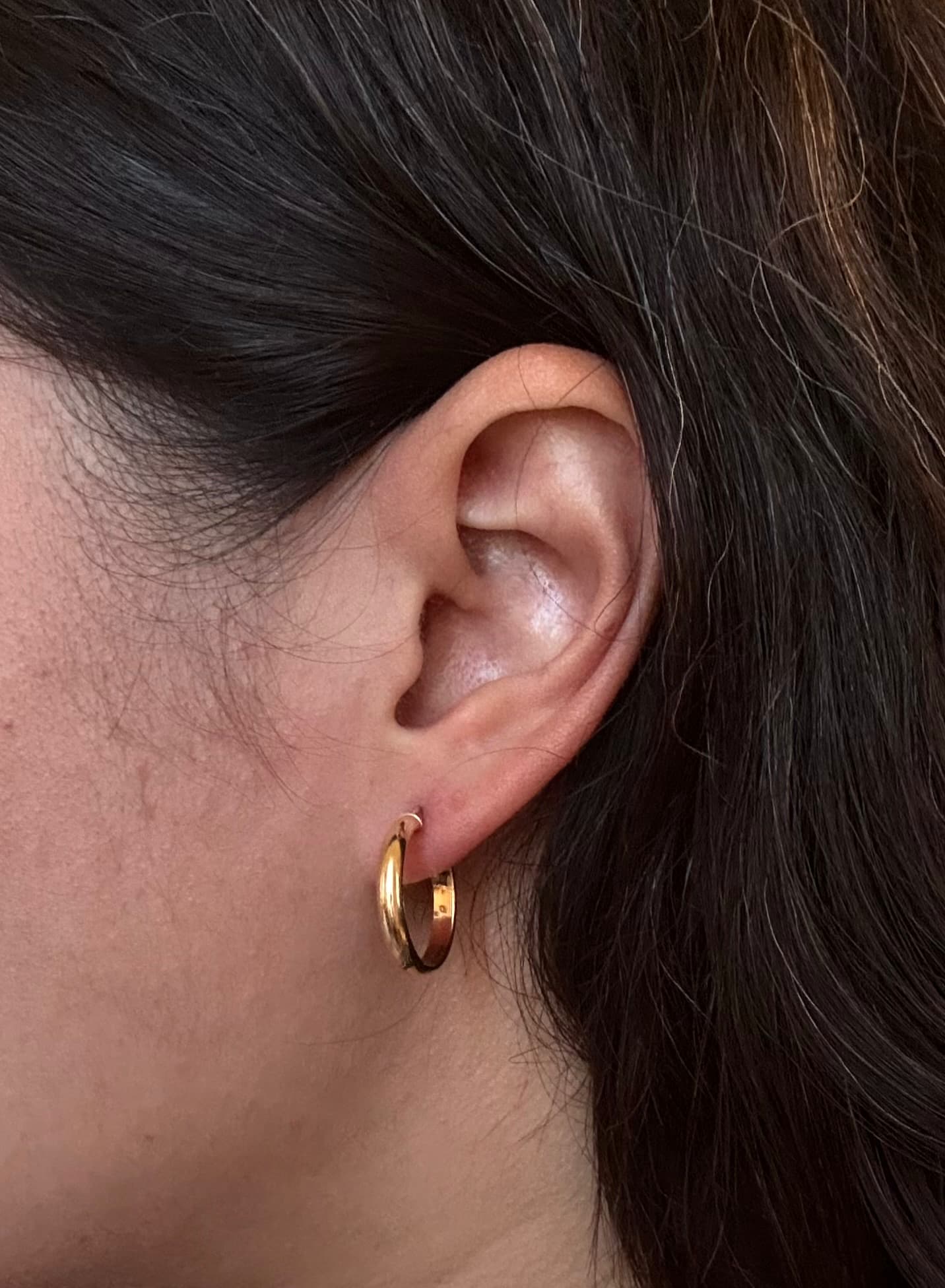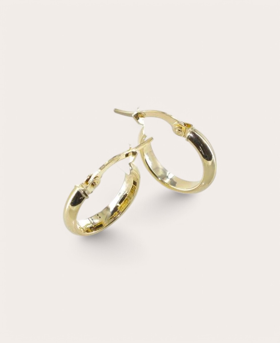 Boucles d’oreilles en or 750 jaune, diamètre 15, demi jonc lisse 3 mm. La forme semi-ronde du demi jonc allie confort et élégance, parfaite pour un style à la fois chaleureux et intemporel.