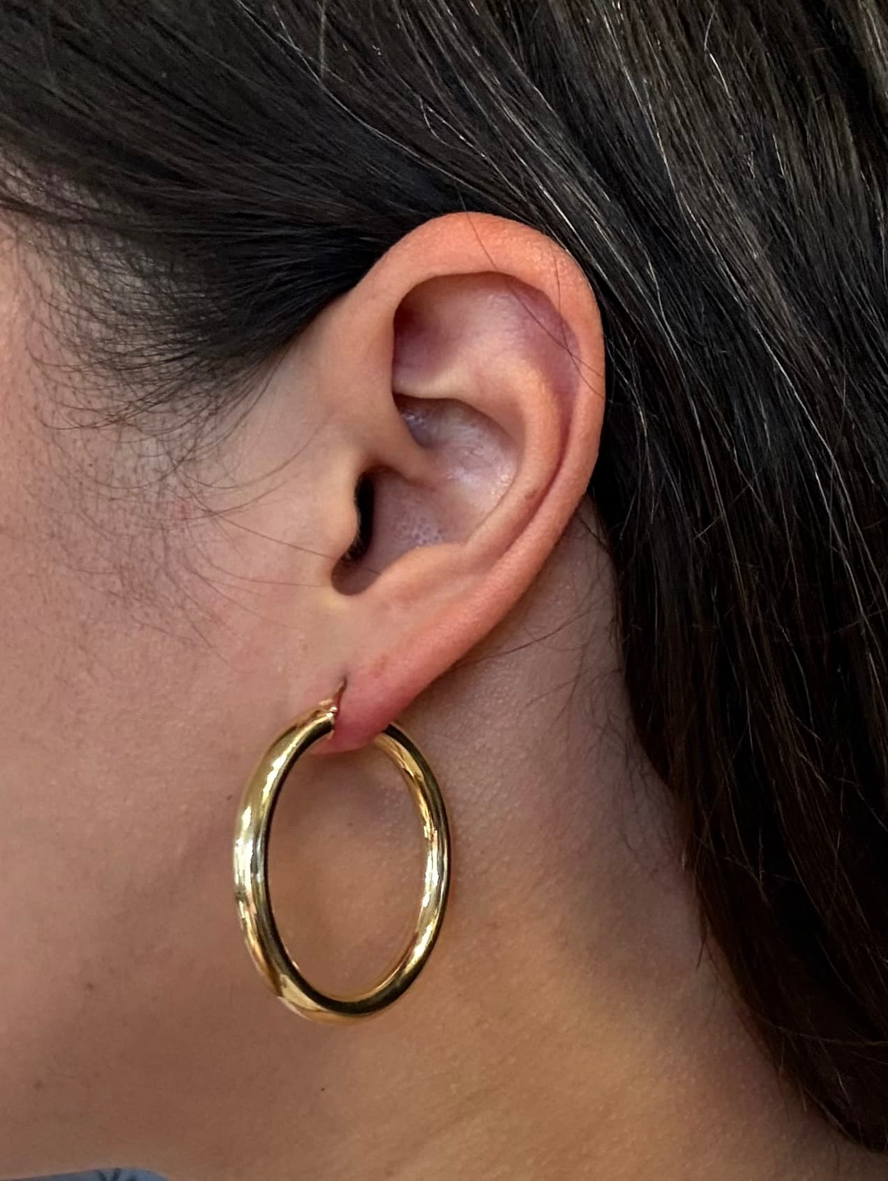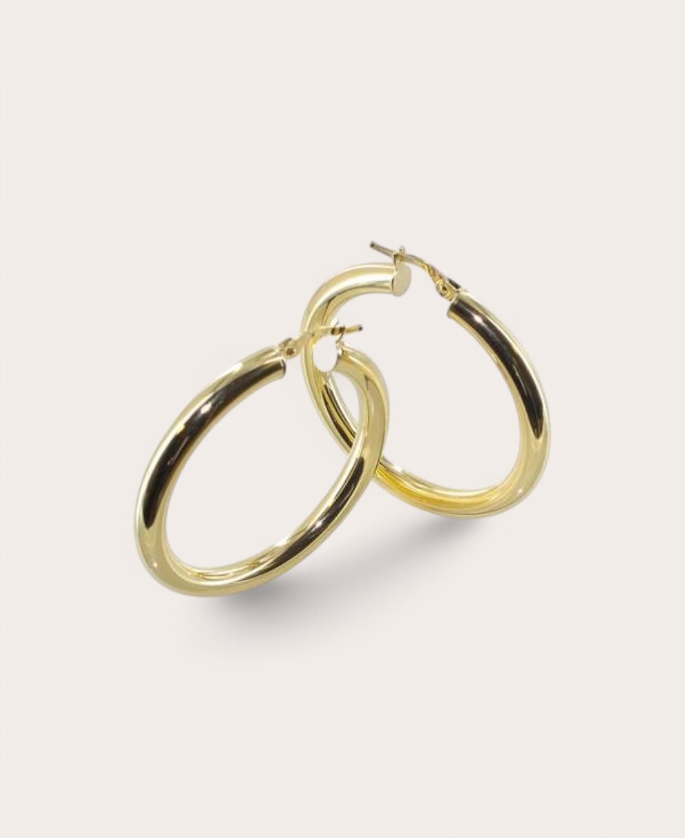 Boucles d’oreilles en or 750 jaune, diamètre 30, ronde lisse 4 mm. Avec une belle épaisseur, elles allient robustesse et élégance, parfaites pour un style à la fois remarquable et intemporel.